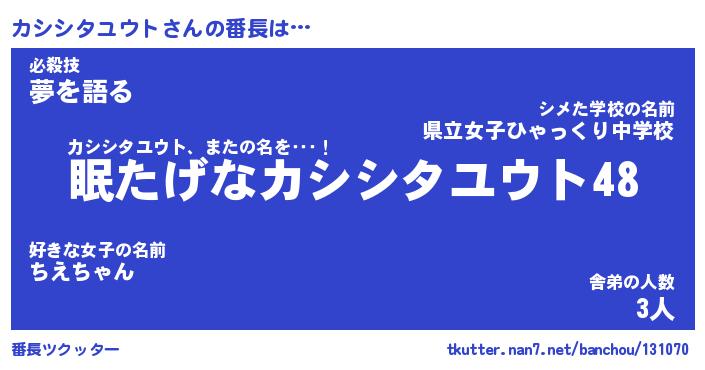 | 男性向けラノベタイトル風あだ名 | 『カシシタユウトアートオンライン』 |