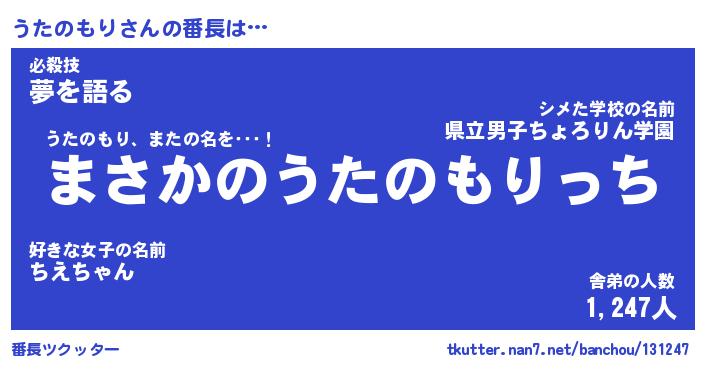| 肩書あだ名 | 『うたのもり店長』『うたのもり国家主席』 |