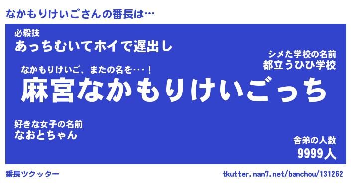| 男性向けラノベタイトル風あだ名 | 『ナカモリケイゴアートオンライン』 |
