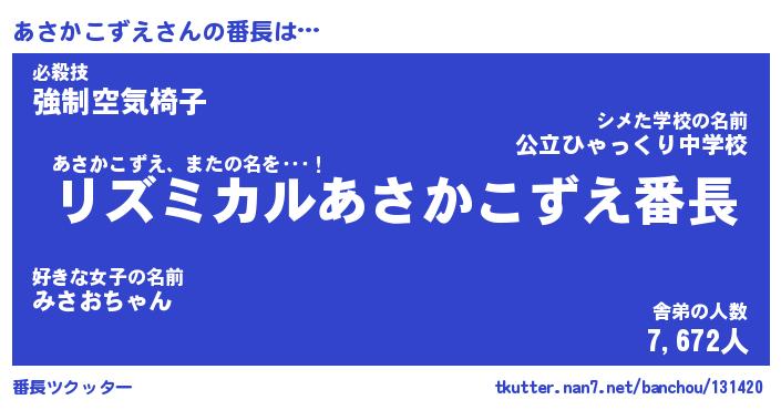 | ヒーロー風カッコイイあだ名 | 『スーパーアサカコズエ』『炎刃騎士アサ』 |