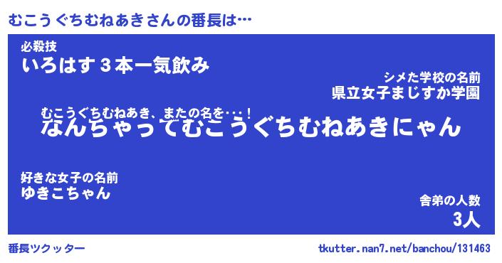 | ヒーロー風カッコイイあだ名 | 『スーパームコウグチムネアキ』 |
