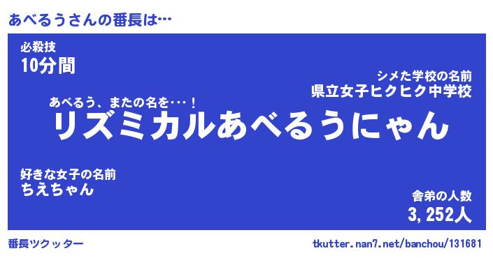 | 意味不明あだ名 | 『ペロリンあべるう』『永久保存あべるう』 |