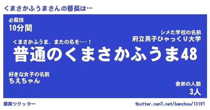 | 伝説のあだ名 | 『不死鳥のスナイパーくまさかふうま』 |