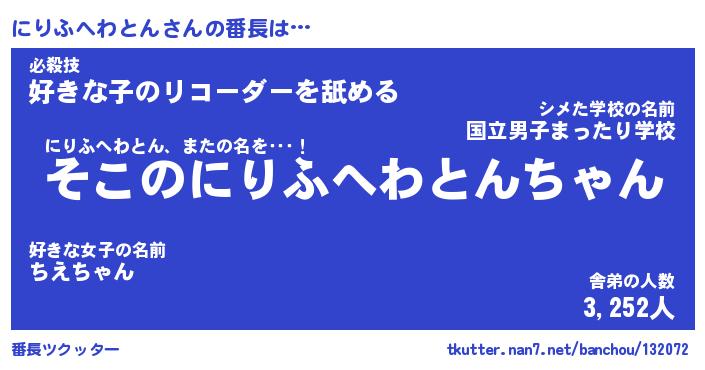 | 男性向けラノベタイトル風あだ名 | 『にりふへわとんの憂鬱』 |