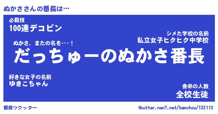 | ヘコむあだ名 | 『ぬかもー』『つくし』『ぬかを』 |