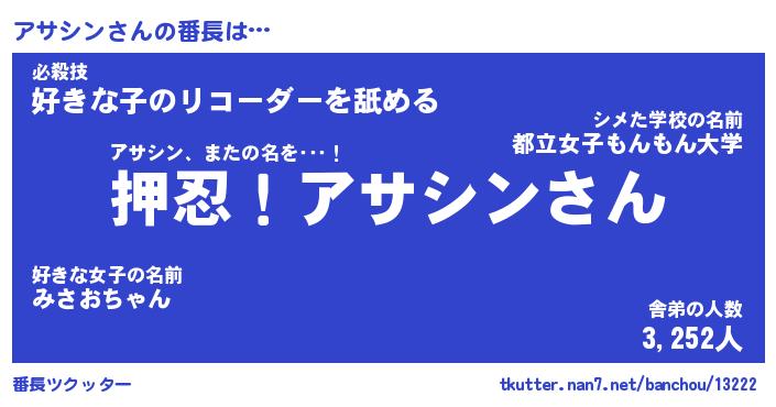 | 意味不明あだ名 | 『ペロリンアサシン』『永久保存アサシン』 |