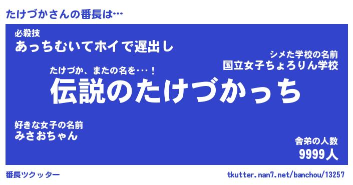 | ヒーロー風カッコイイあだ名 | 『スーパータケヅカ』『天弓騎士タケ』 |