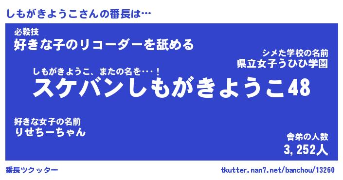 | 肩書あだ名 | 『しもがきようこ御曹司』 |