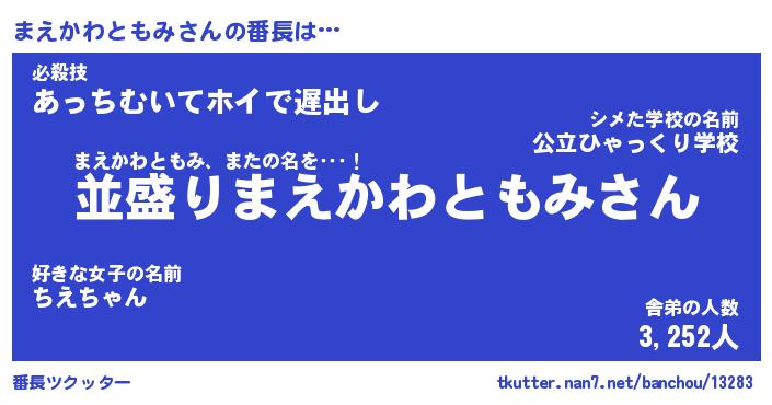 | 伝説のあだ名 | 『不死鳥のスナイパーまえかわともみ』 |