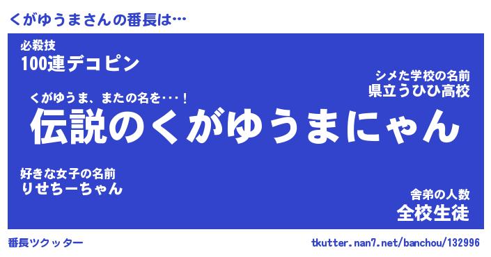 | 伝説のあだ名 | 『伝説のスナイパーくがゆうま』 |
