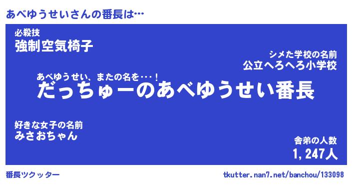 | 肩書あだ名 | 『あべゆうせい店長』『あべゆうせい校長』 |