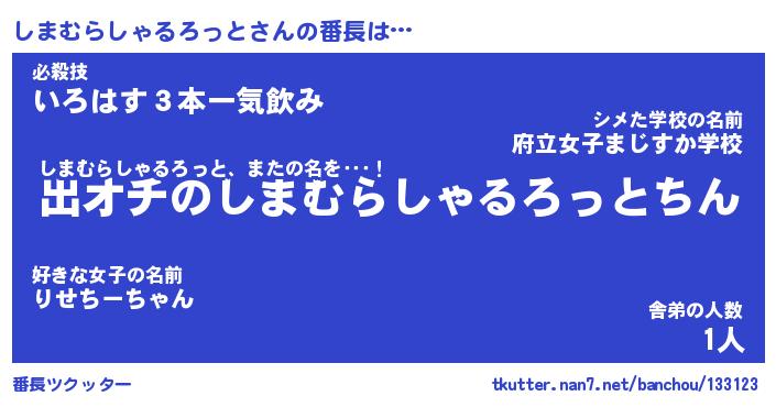 | 伝説のあだ名 | 『伝説のスナイパーしまむらしゃるろっと』 |