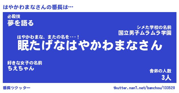 | 伝説のあだ名 | 『封印されしスナイパーはやかわまな』 |