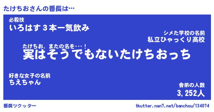 | 意味不明あだ名 | 『ペロリンたけちお』『永久保存たけちお』 |