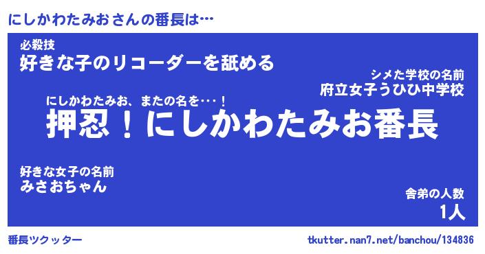 | 肩書あだ名 | 『にしかわたみお御曹司』 |