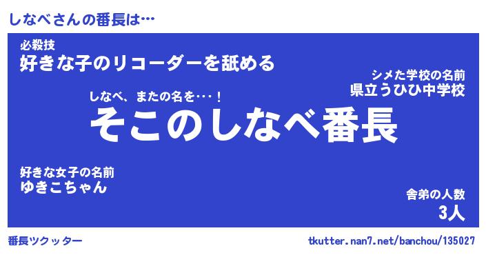 | ヒーロー風カッコイイあだ名 | 『スーパーシナベ』『ウルトラしなべマン』 |
