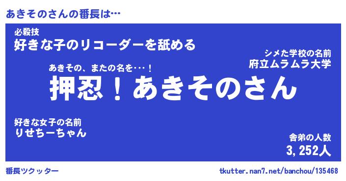 | 肩書あだ名 | 『あきその店長』『あきその大統領』 |