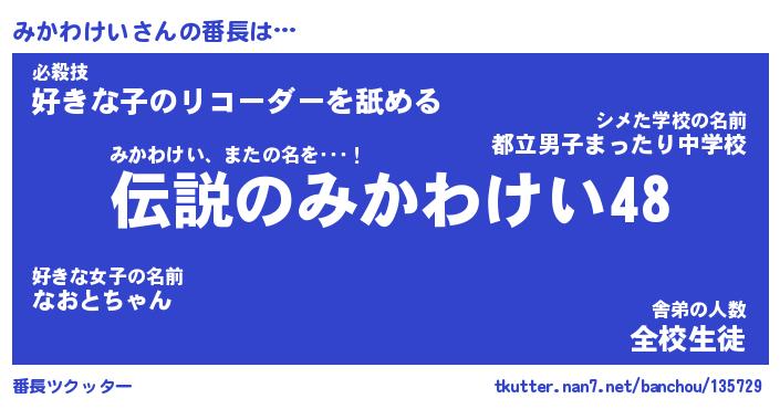 | 伝説のあだ名 | 『伝説のスナイパーみかわけい』 |