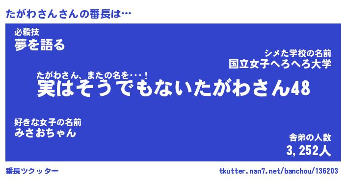 | ファンタジー風あだ名 | 『タガフェル』『エターナルタガワサンー』 |