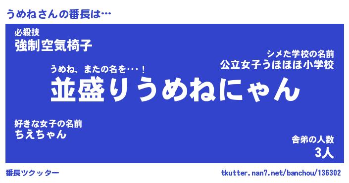 | ヒーロー風カッコイイあだ名 | 『スーパーウメネ』『ウルトラうめねマン』 |