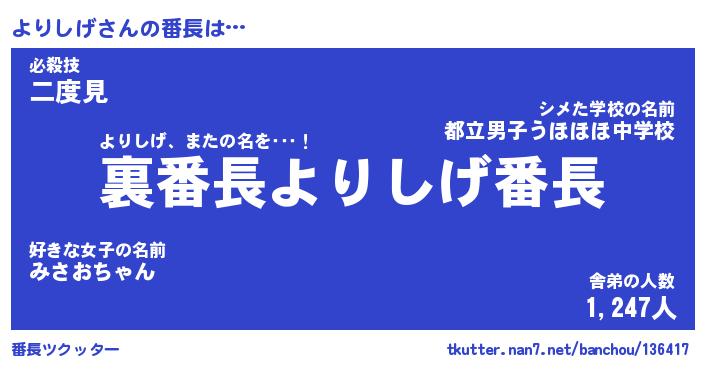 | 意味不明あだ名 | 『ペロリンよりしげ』『永久保存よりしげ』 |