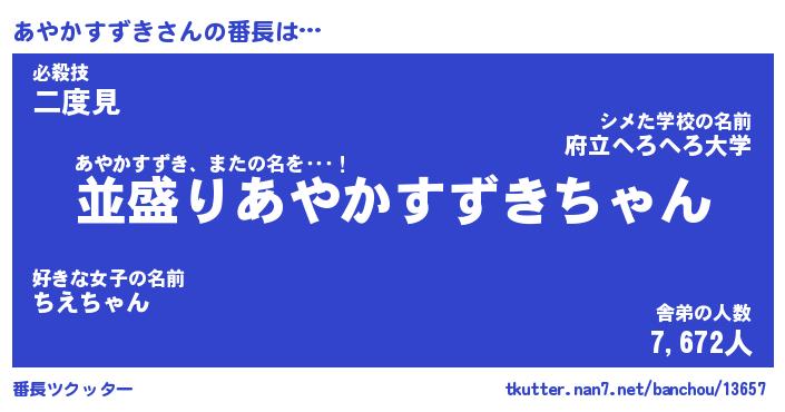 | ヒーロー風カッコイイあだ名 | 『スーパーアヤカスズキ』『炎刃騎士アヤ』 |