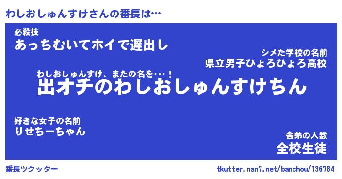 | 男性向けラノベタイトル風あだ名 | 『わしおしゅんすけの憂鬱』 |