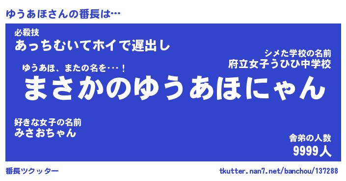| 意味不明あだ名 | 『ペロリンゆうあほ』『永久保存ゆうあほ』 |