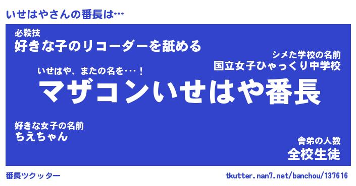 | 肩書あだ名 | 『いせはやCEO』『いせはや大統領』 |