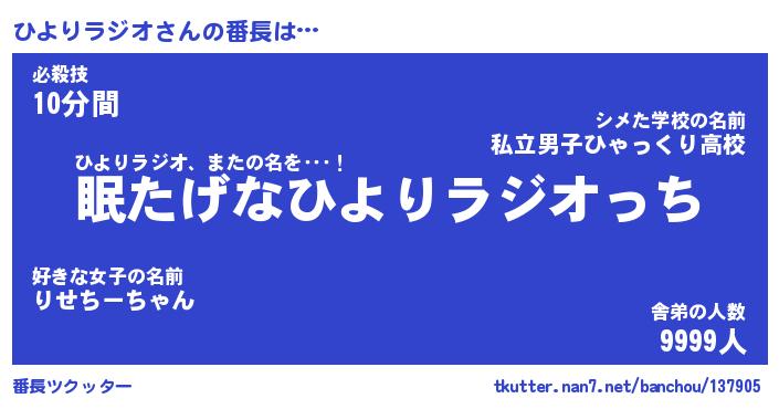 | 肩書あだ名 | 『ひよりラジオ社長』『ひよりラジオ教頭』 |