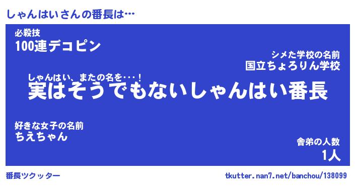| 伝説のあだ名 | 『封印されしスナイパーしゃんはい』 |