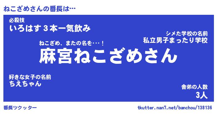 | ヘコむあだ名 | 『ねこにー』『なまこ酢』『ねこ太郎』 |
