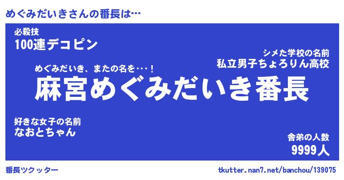 | 伝説のあだ名 | 『不死鳥のスナイパーめぐみだいき』 |
