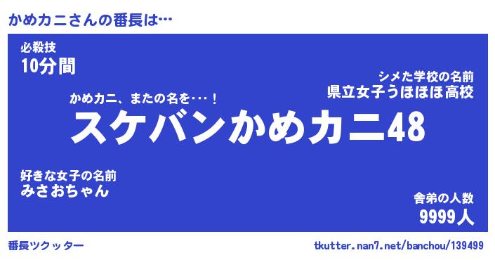 | 意味不明あだ名 | 『ペロリンかめカニ』『永久保存かめカニ』 |
