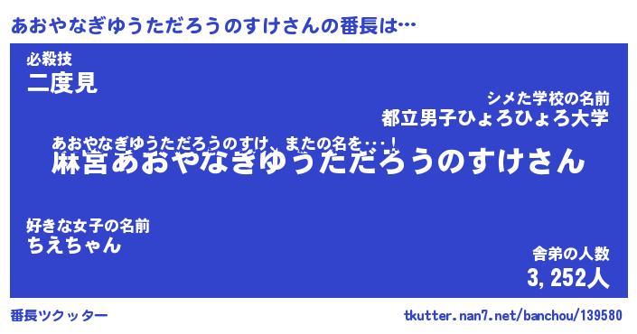 | 意味不明あだ名 | 『ペロリンあおやなぎゆうただろうのすけ』 |