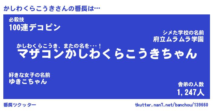 | ヒーロー風カッコイイあだ名 | 『スーパーカシワクラコウキ』 |