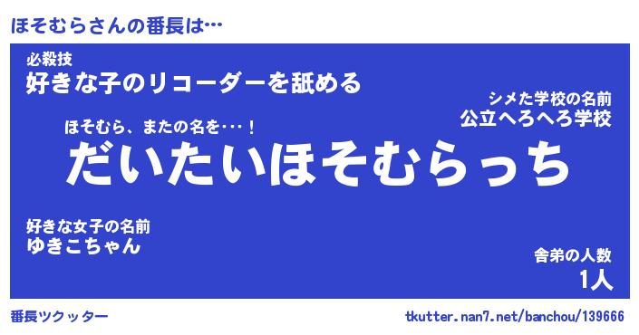| 意味不明あだ名 | 『ペロリンほそむら』『永久保存ほそむら』 |