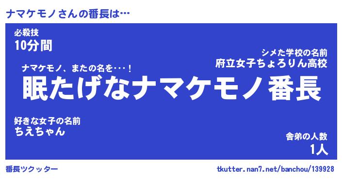 | ヒーロー風カッコイイあだ名 | 『スーパーナマケモノ』『黄金騎士ナマ』 |