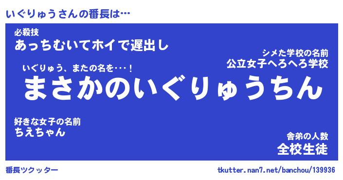 | 男性向けラノベタイトル風あだ名 | 『いぐりゅうの憂鬱』 |