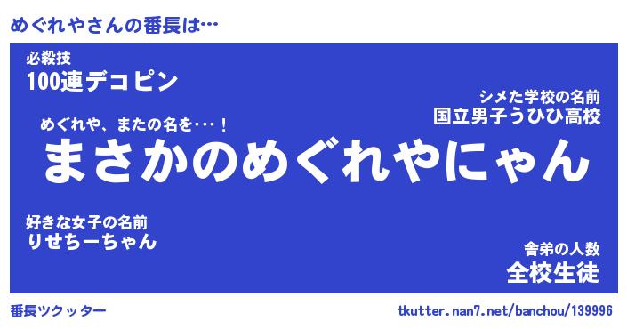 | 意味不明あだ名 | 『ペロリンめぐれや』『永久保存めぐれや』 |