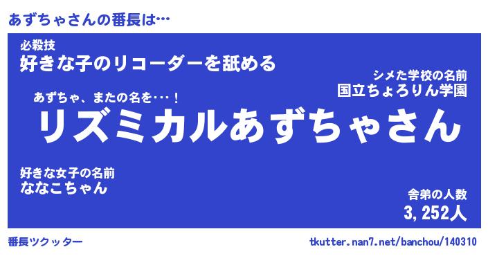 | 男性向けラノベタイトル風あだ名 | 『あずちゃの憂鬱』 |