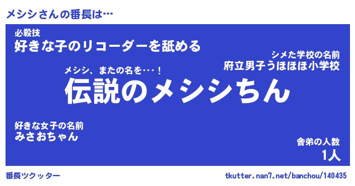 | ヒーロー風カッコイイあだ名 | 『スーパーメシシ』『ウルトラメシシマン』 |