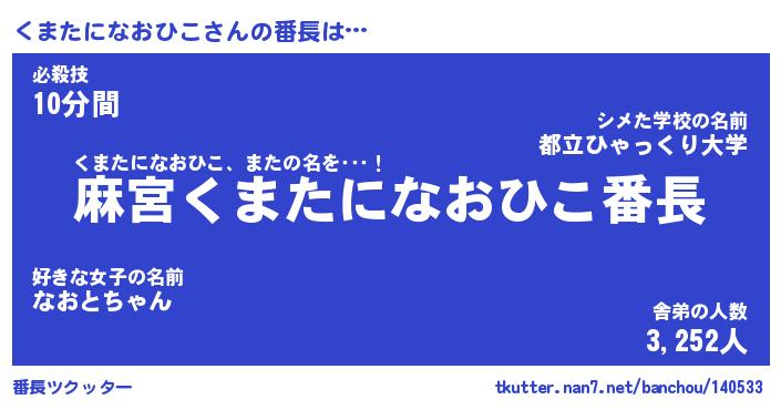 | 男性向けラノベタイトル風あだ名 | 『クマタニナオヒコアートオンライン』 |