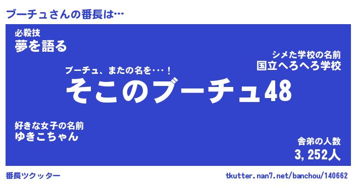 | 肩書あだ名 | 『ブーチュ社長』『ブーチュ大統領』 |