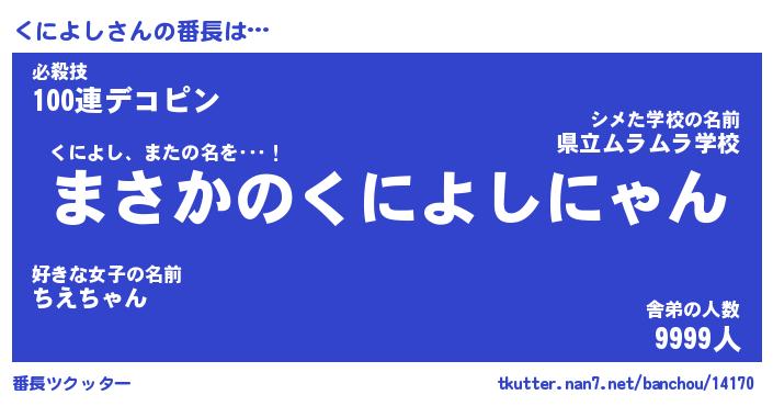 | ヒーロー風カッコイイあだ名 | 『スーパークニヨシ』『天弓騎士クニ』 |