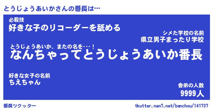 | 男性向けラノベタイトル風あだ名 | 『とうじょうあいかの憂鬱』 |