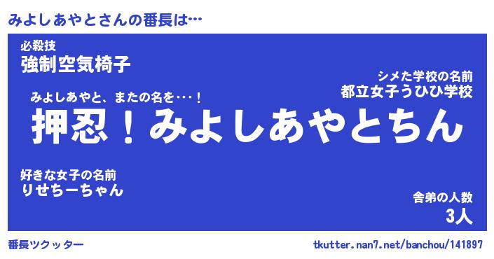 | ヒーロー風カッコイイあだ名 | 『スーパーミヨシアヤト』『暗黒騎士ミヨ』 |