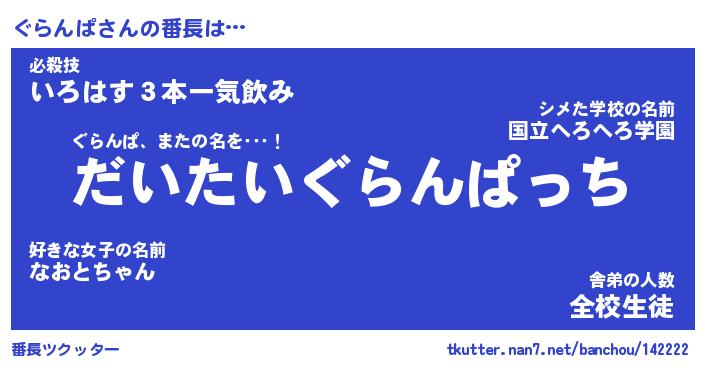 | 意味不明あだ名 | 『ペロリンぐらんぱ』『永久保存ぐらんぱ』 |