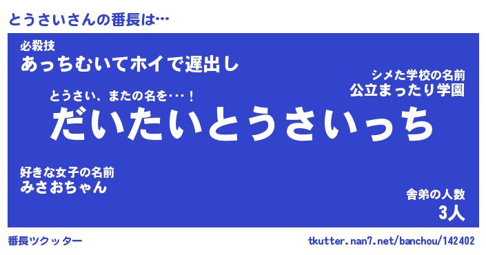| ヒーロー風カッコイイあだ名 | 『スーパートウサイ』『銀牙騎士トウ』 |