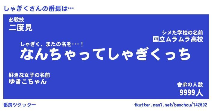 | ヒーロー風カッコイイあだ名 | 『スーパーシャギク』『天弓騎士シャ』 |
